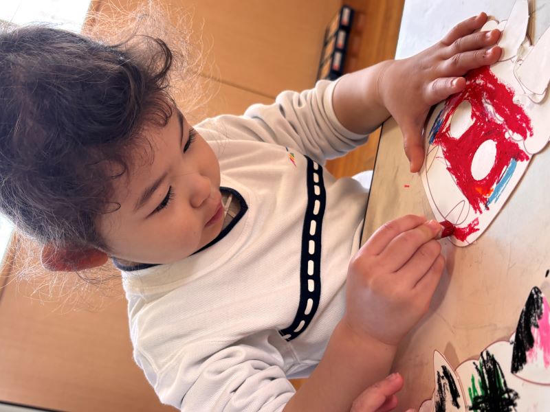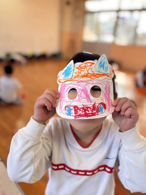 節分に向けて、鬼のお面製作です。好きな色を選んで、力強く色塗りしました❗「あかおに・にじいろおに」等、色々な鬼さんが完成し、鬼退治の準備万端です⭐