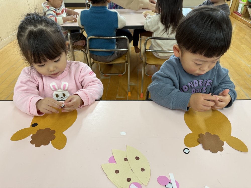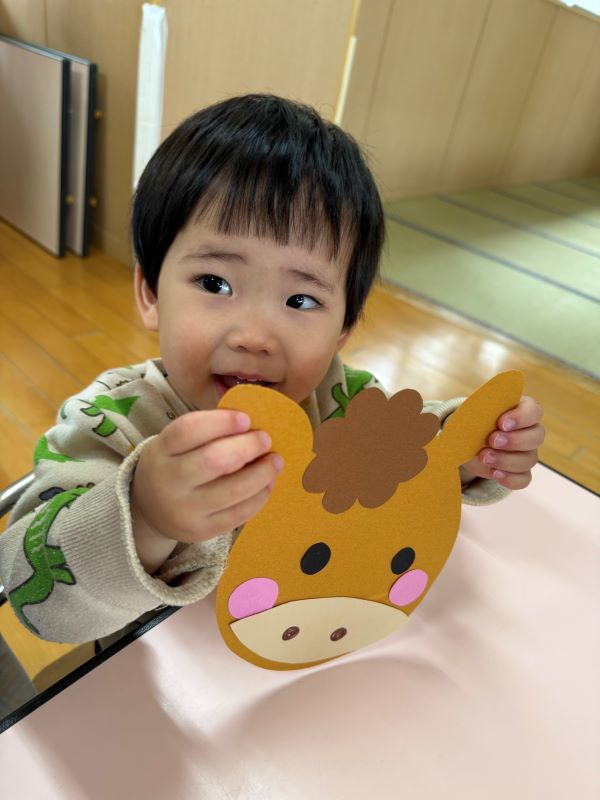 馬の製作🐴「ここ?」と、顔のパーツを一つひとつ貼って楽しみました。「完成したお馬さんはどう😄??」