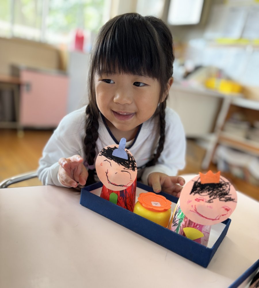 「わあ、出てきた!」と絵の具を重ねると浮かび上がる模様を楽しみながら、個性豊かな素敵なお雛様が完成しました★